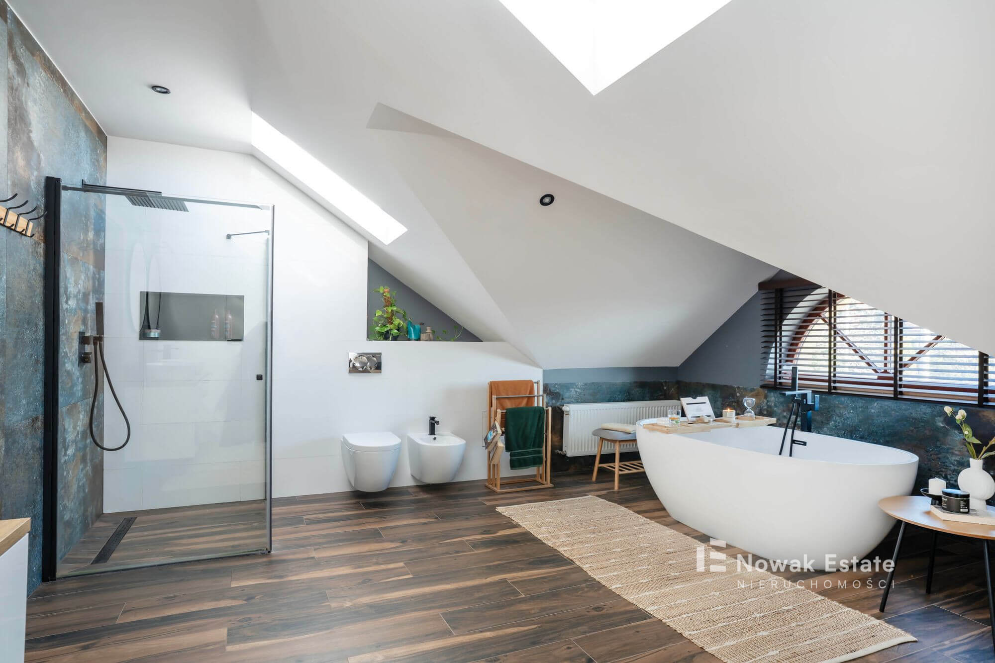 - duży pokój kąpielowy z wanną i prysznicem