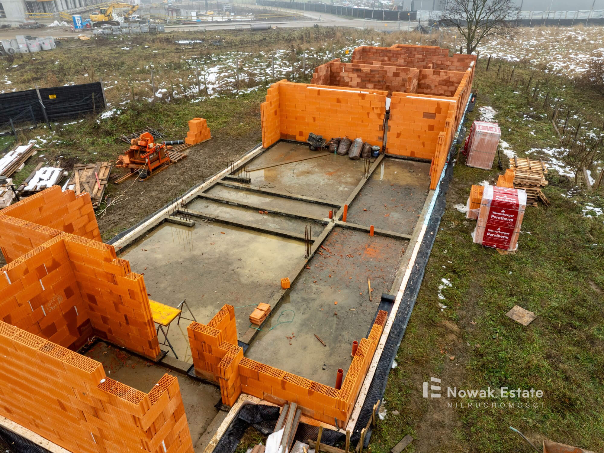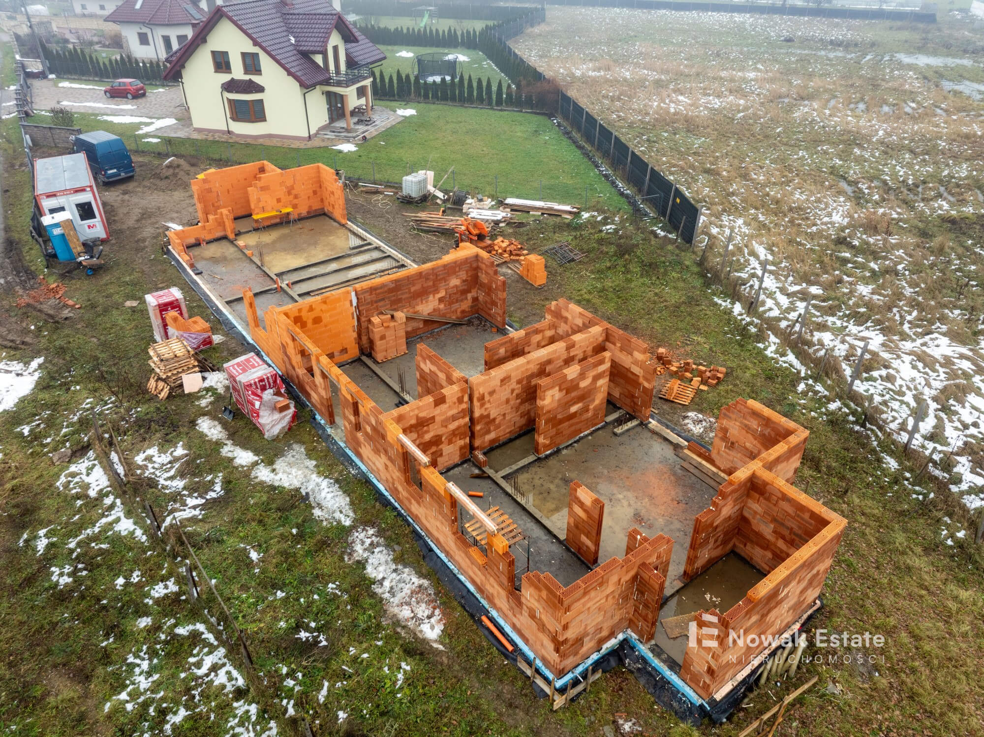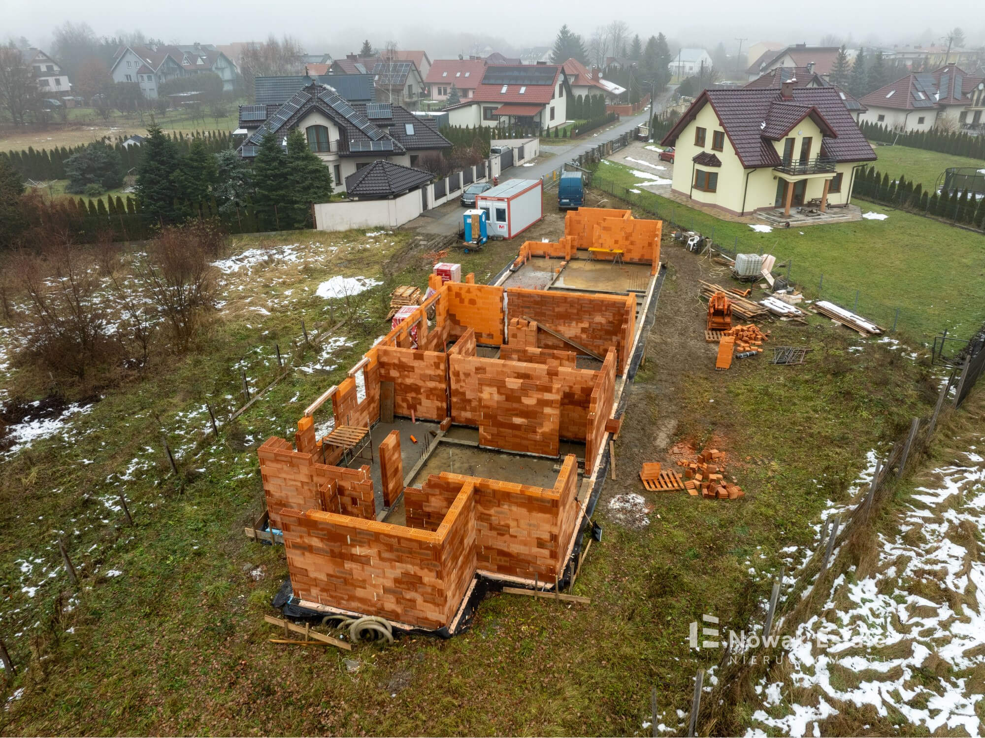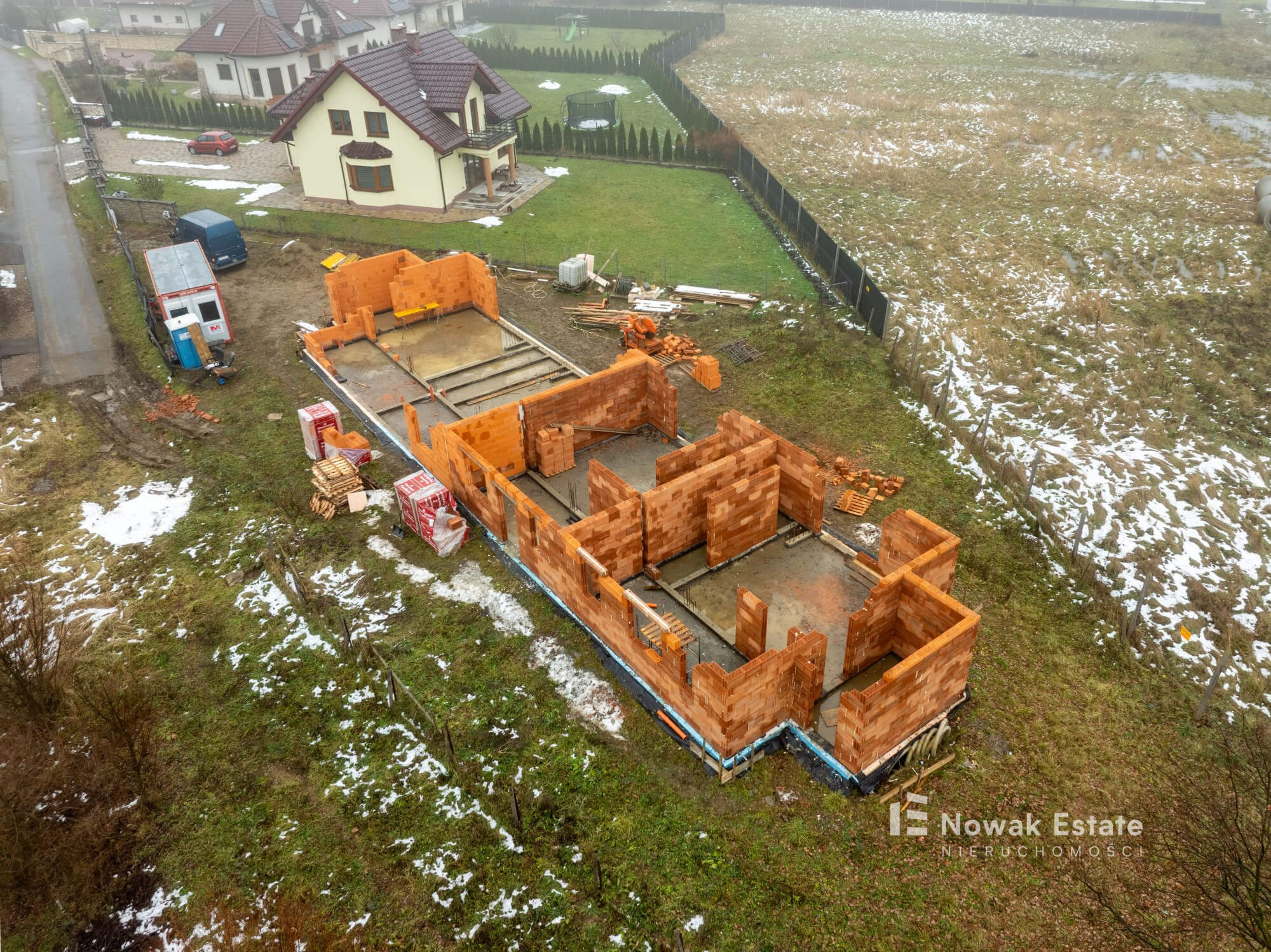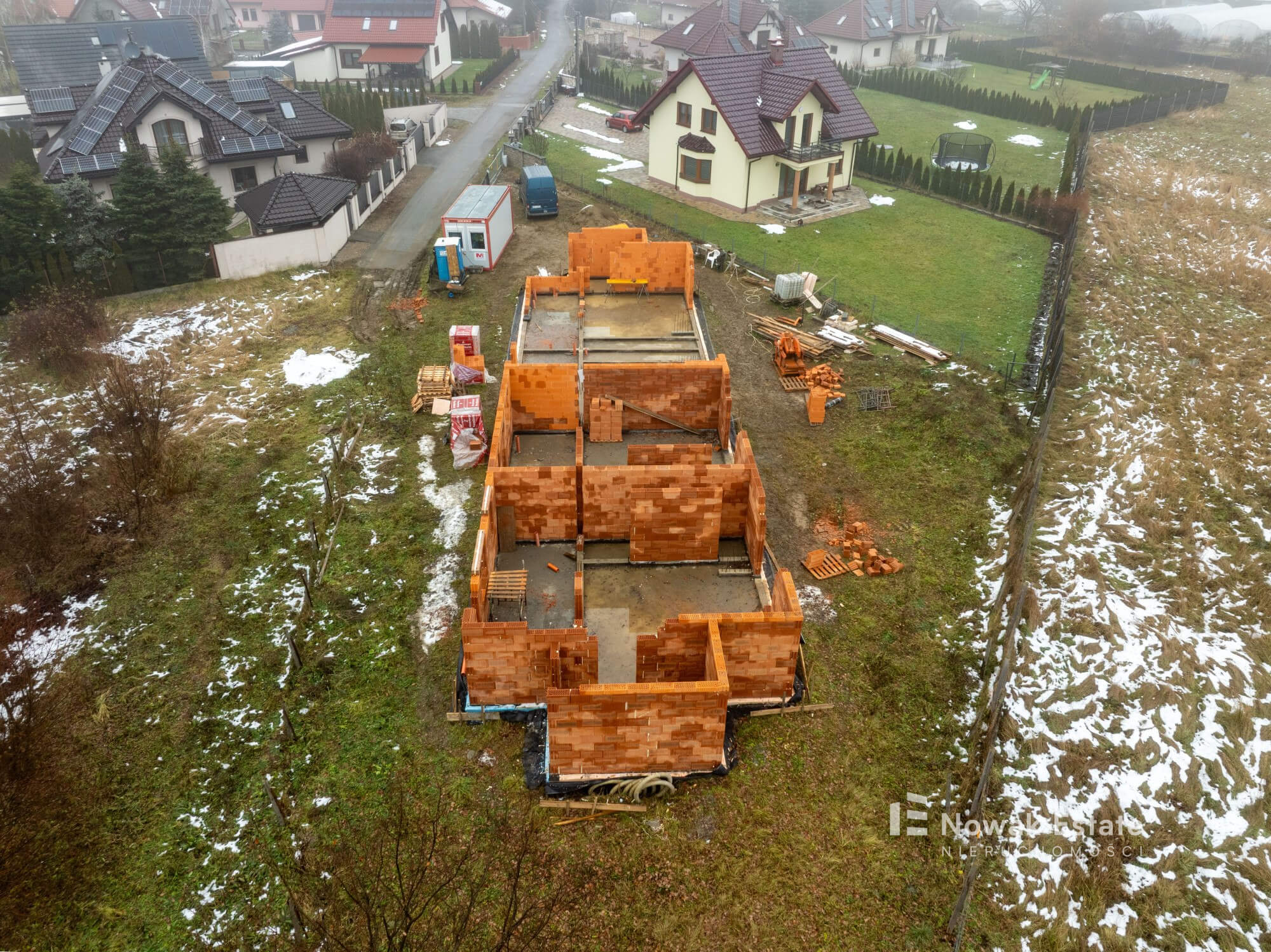Inwestycja składa się z 2 budynków w zabudowie bliźniaczej, w każdym z nich są po 2 segmenty mieszkalne (łącznie 4 domy). Konstrukcja tradycyjna murowana, ściany z pustaka, okna 3szybowe.