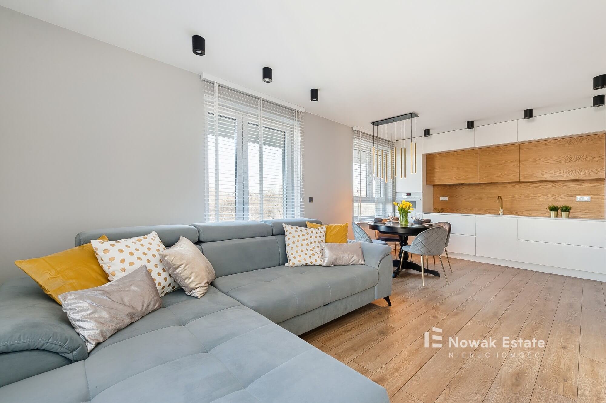 – jasny salon z aneksem kuchennym oraz balkonem