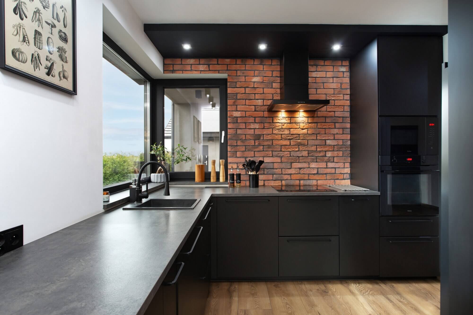 - Przestronny salon z kominkiem – miejsce, w którym domownicy mogą odpoczywać i spędzać razem czas. Panoramiczne okna wpuszczają mnóstwo naturalnego światła i otwierają widok na ogród.